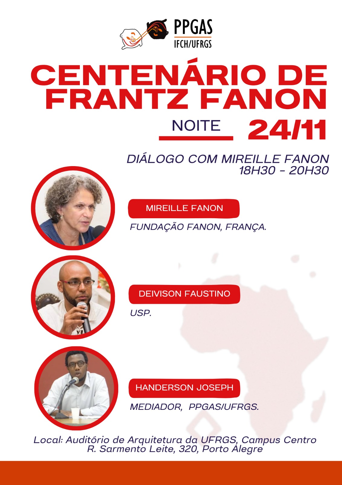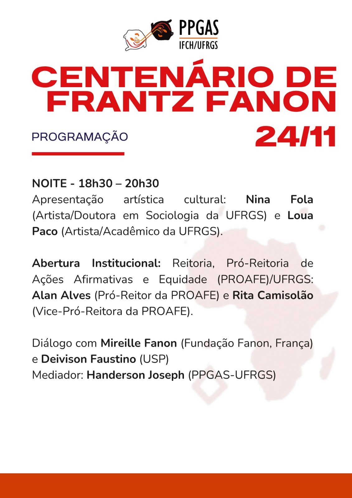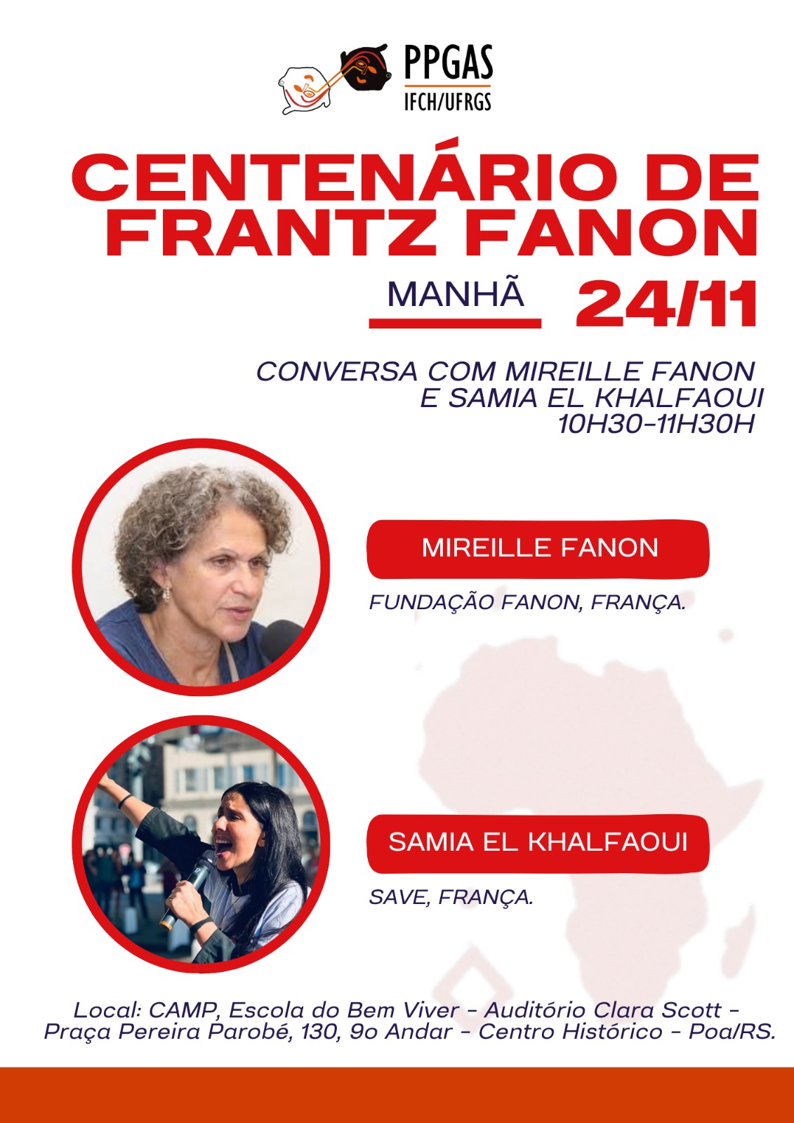 Matin : Table ronde avec Mireille Fanon, Samia El Khalfaoui, des parlementaires et des représentants de mouvements sociaux du Rio Grande do Sul sur le thème « Centenaire de Frantz Fanon : Pour une lutte anticoloniale ». L’évenement se déroulera dans l’auditorium d’architecture de l’UFRGS.